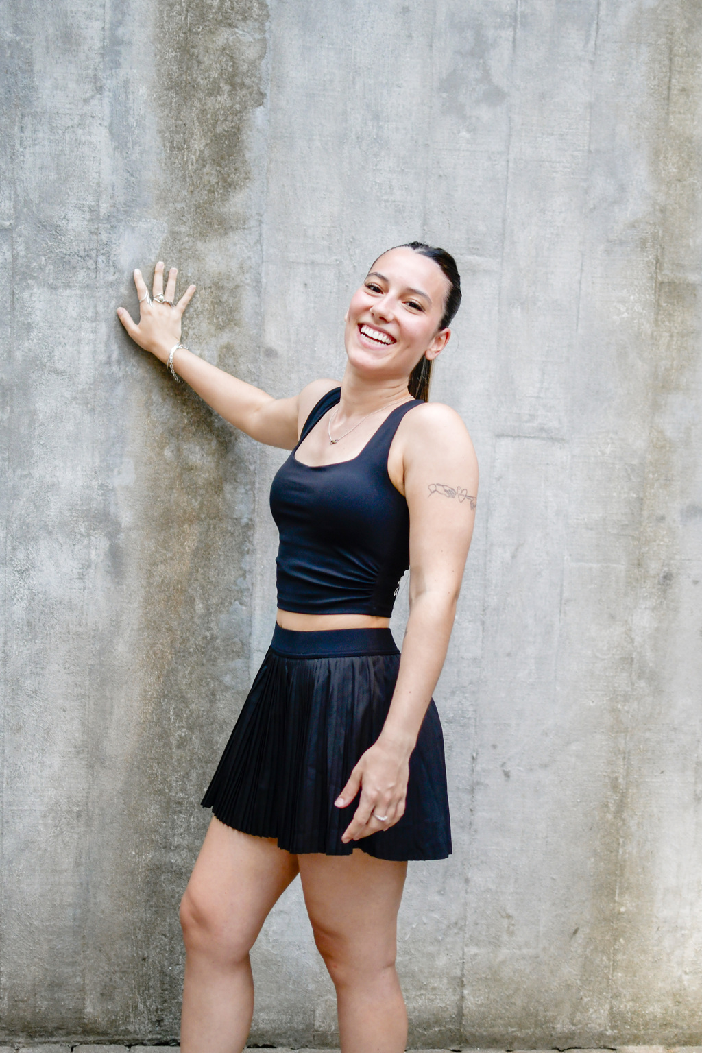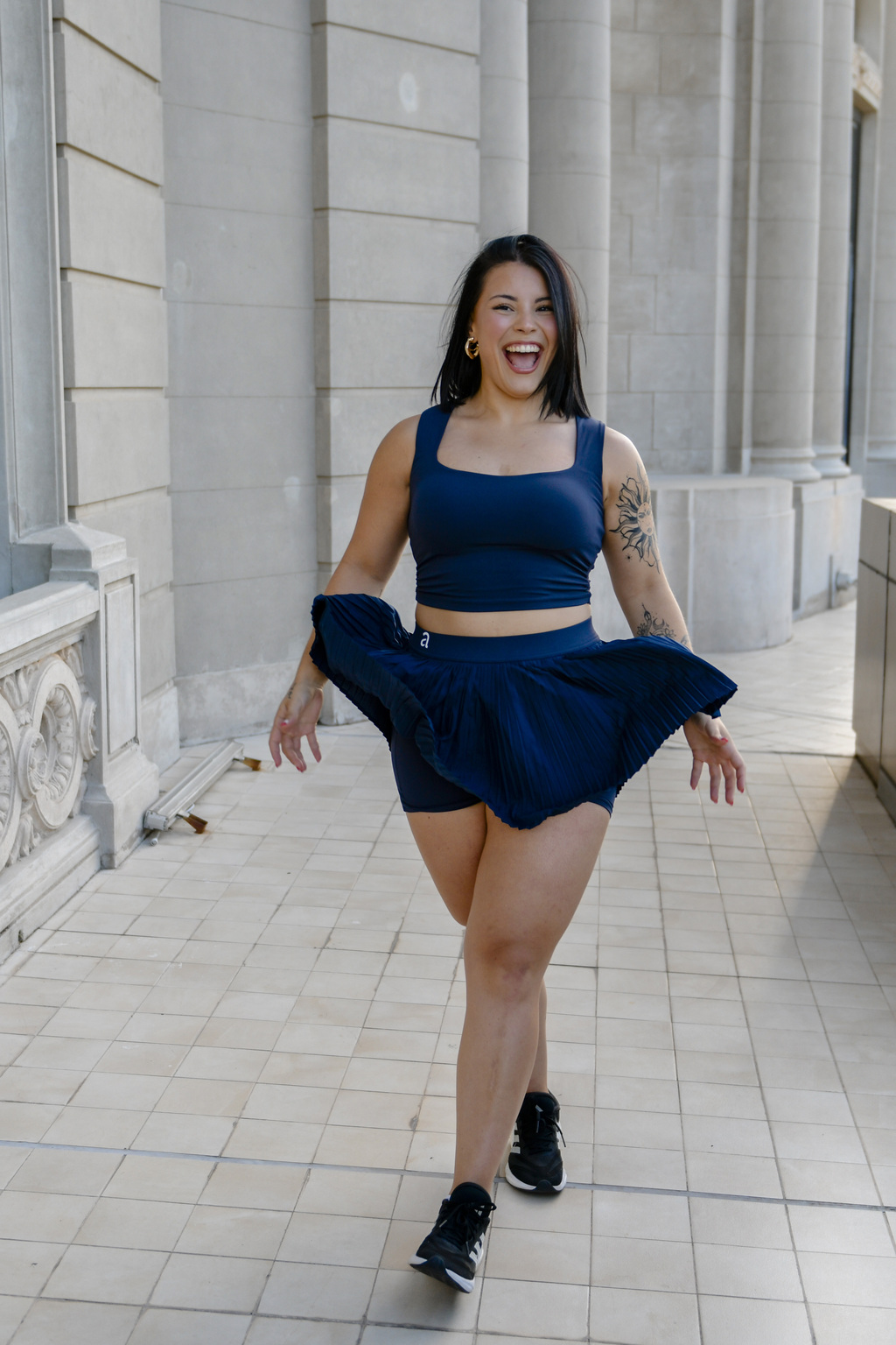 Pollera de tenis plisada, con calza corta debajo que cuenta con bolsillo. Cintura con elástico.